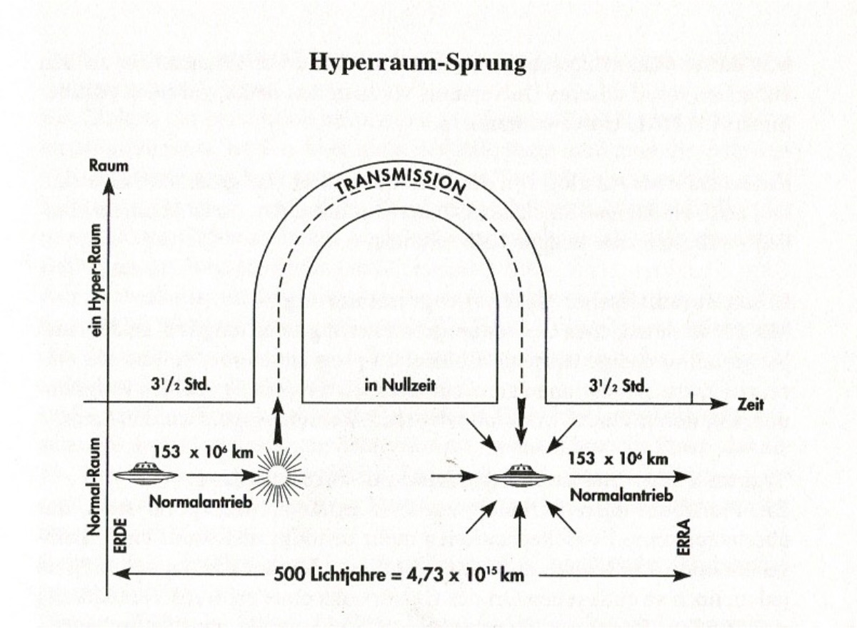 An illustrative drawing made by Guido Moosbrugger from his book “Flugreisen durch Zeit und Raum Reale Zeitreisen” (2001) page 301 This is the sketch Billy Meier refers to which shows the travel time the space ship needs using the normal propulsion drive, 3,5 hours, to clear the security distance from the departing planet.It then reached the transmission point which is where the hyperdrive kicks inn and the spaceship dematerializes and light years is bridged in zero time. After the hyperspace trip is over, the spaceship remateralizes again and travel for another 3,5 hours, using the normal propulsion drive to reach the destination planet. So this makes the travel time from a planet A (Earth) to a planet B (Erra) 7 hours in total.