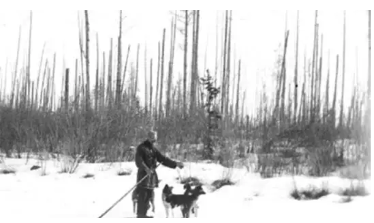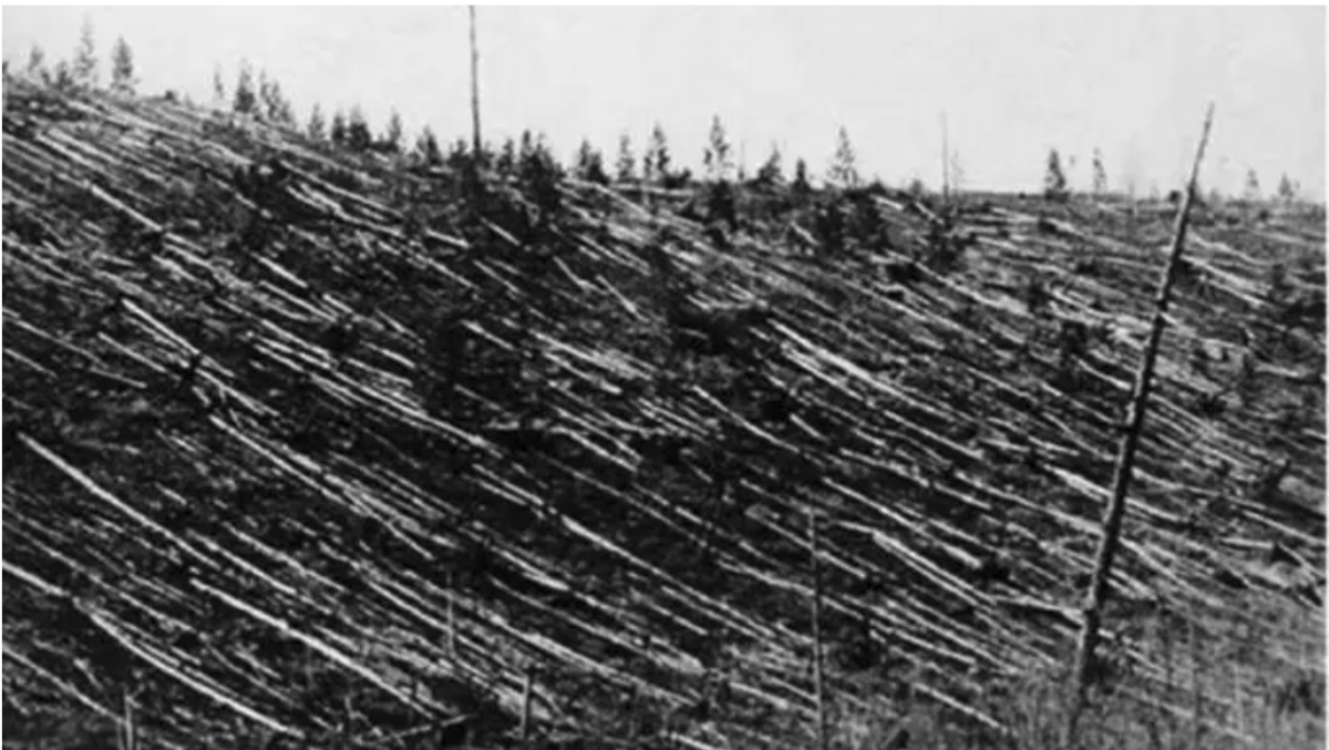 Captured during a landmark 1920s scientific expedition led by Soviet mineralogist Leonid Kulik, these photographs documents the radial destruction caused by the Tunguska air blast. Nearly two decades after the 1908 event, the image reveals millions of trees leveled by a massive shockwave, with those at the epicenter left standing like "telegraph poles"—stripped of branches and bark but still rooted