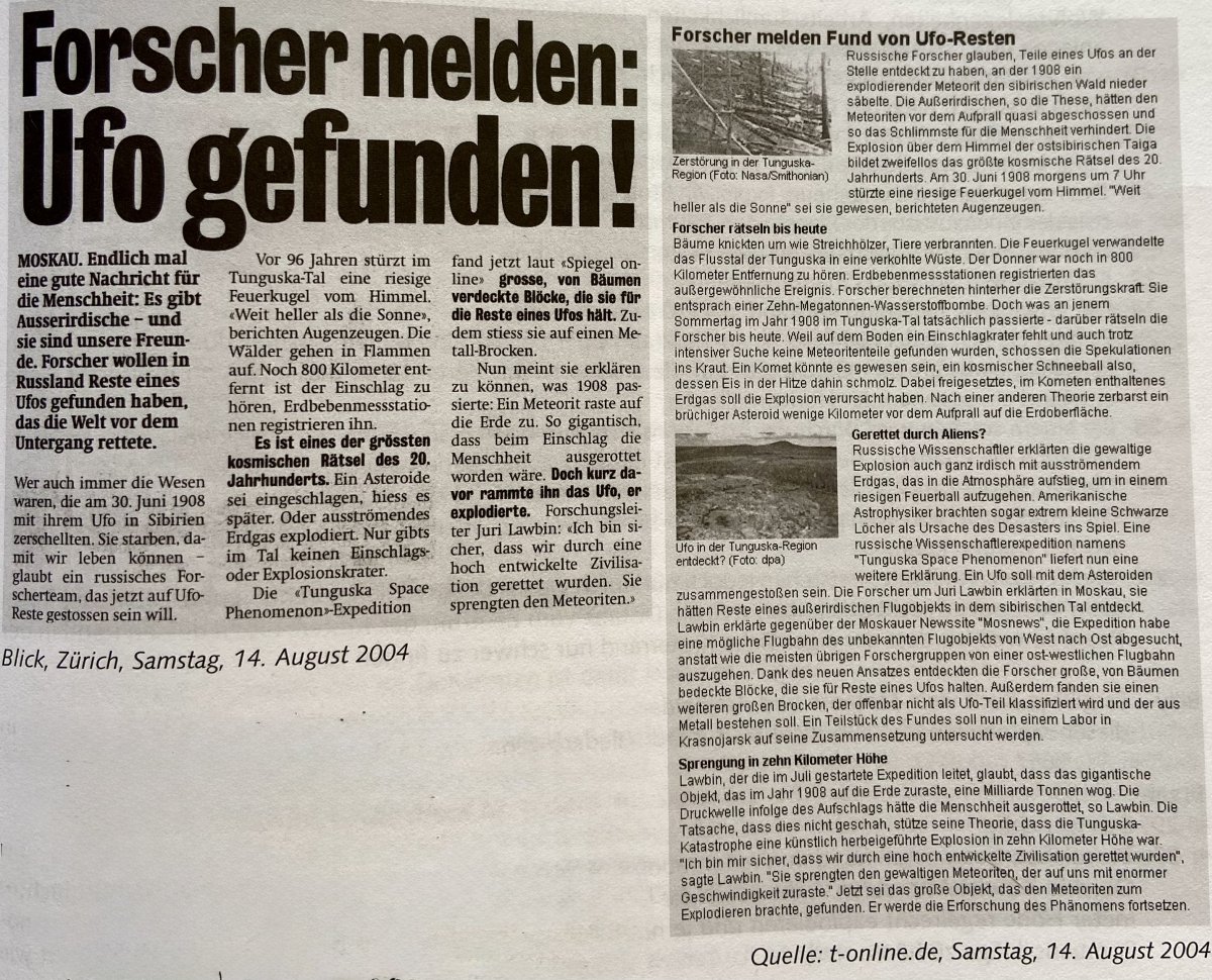 Tunguska-Katastrophe: Forscher melden Fund von Ufo-Resten Russische Forscher glauben, Teile eines Ufos an der Stelle entdeckt zu haben, an der 1908 ein explodierender Meteorit den sibirischen Wald niedersäbelte. Die Ausserirdischen, so die These, hätten den Meteoriten vor dem Aufprall quasi abgeschossen und so das Schlimmste für die Menschheit verhindert.
